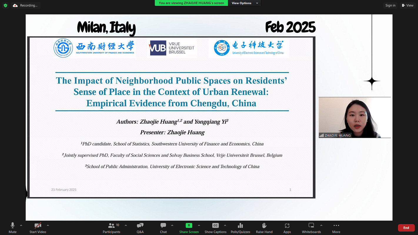 | Dr. Zhaojie Huang | Southwestern University of Finance and Economics, Vrije Universiteit Brussel | The Impact of Neighborhood Public Spaces on Residents’ Sense of Place in the Context of Urban Renewal: Empirical Evidence from Chengdu, China |